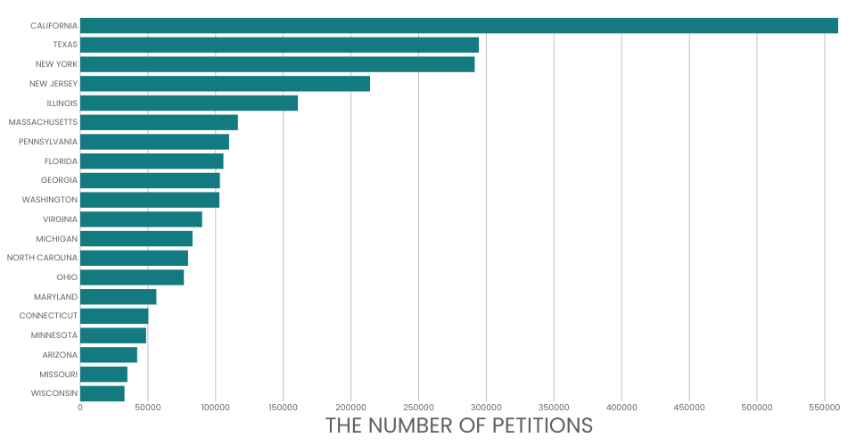 A program that shows the number of petition for visa in each states with descending order. In this picture, It only shows top 20 states.