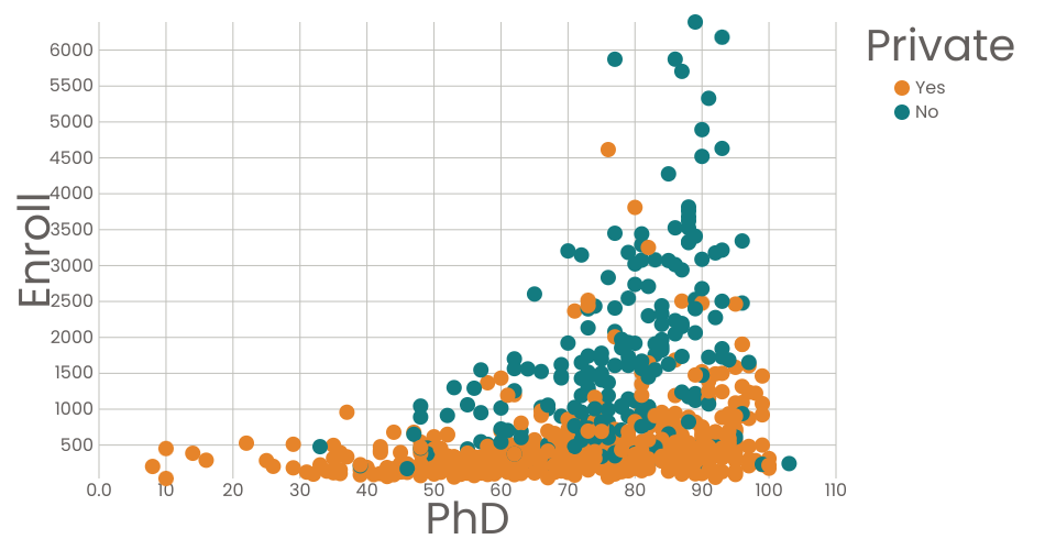 Enroll: number of new students enrolled. Phd: Percent of faculty with Ph.D's Private: Public/Private indicator.