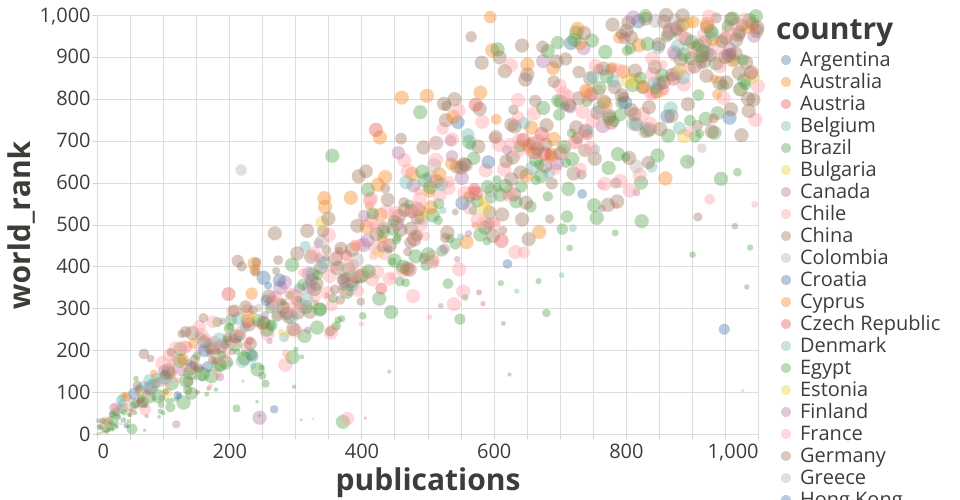 This is a scatter plot of academic publication influence on University Ranking. The size of each bubble indicates the number of alumni_employment.
