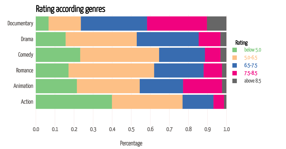 This bar chart gives the percentage of each rating level within difference genres, to show the impact of genre on movie ratings.