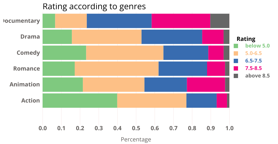 This bar chart gives the percentage of each rating level within difference genres, to show the impact of genre on movie ratings.