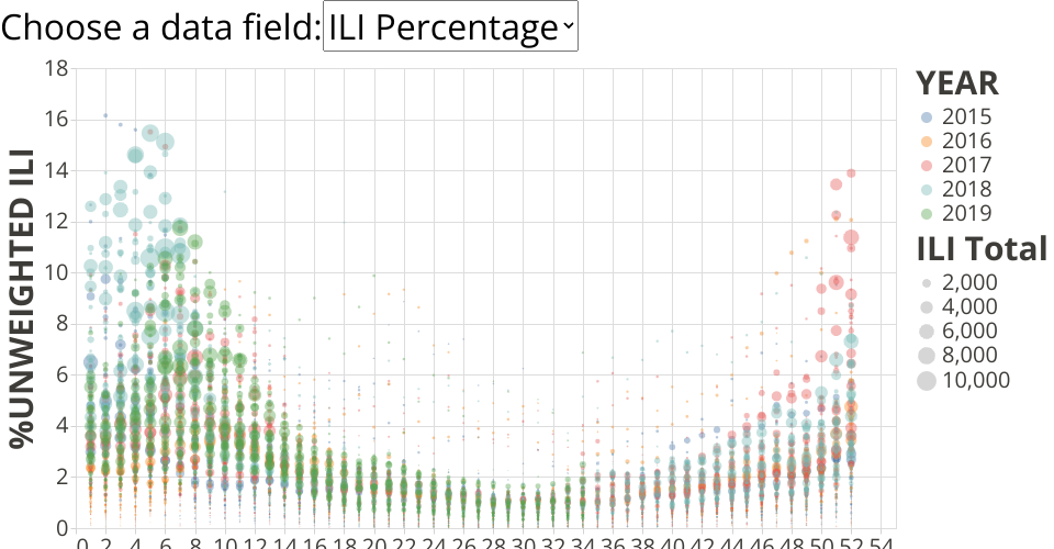 In this ILINet Flu Surveillance dataset, we have ILITOTAL to indicate the number of patients recorded by the network. The %UNWEIGHTED ILI is actually the ratio to total number of patients served. Clearly this value could be large if the base numbers are small. In the single plot, we show all data by the week of the year since 2015. Each data point represent a state on the same week, different color indicates different years. We also assigned the ILITOTAL number to the size channel, which maps the bigger size to larger number of patients. From the plot we can see that the big size mostly happens at the end of the year till at the beginning of the year, which is the flu season. Although the %ILI data indicates similar results, the size gives more sharper results. Also the points at the bottom of the weeks are all smaller, which allows us to visualize the bigger patients’ number more easily on the plot, it happens on both end of each week’s line because the data with smaller number of patient are generally ignorable.