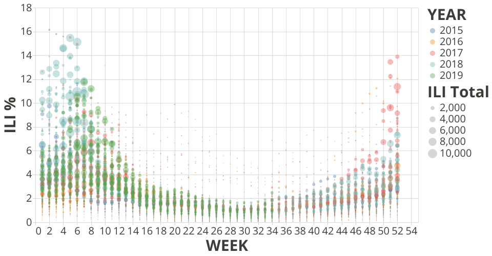 In this ILINet Flu Surveillance dataset, we have ILITOTAL to indicate the number of patients recorded by the network. The %UNWEIGHTED ILI is actually the ratio to total number of patients served. Clearly this value could be large if the base numbers are small. In the single plot, we show all data by the week of the year since 2015. Each data point represent a state on the same week, different color indicates different years. We also assigned the ILITOTAL number to the size channel, which maps the bigger size to larger number of patients. From the plot we can see that the big size mostly happens at the end of the year till at the beginning of the year, which is the flu season. Although the %ILI data indicates similar results, the size gives more sharper results. Also the points at the bottom of the weeks are all smaller, which allows us to visualize the bigger patients’ number more easily on the plot, it happens on both end of each week’s line because the data with smaller number of patient are generally ignorable.