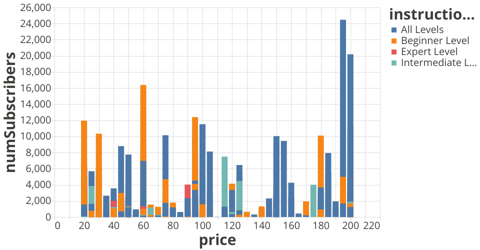 We can observe that the price of most beginner level classes fall into the range from 20 to 80, and the most expensive courses also have most subscribers.