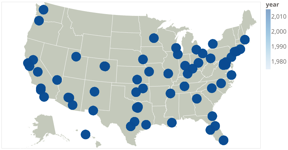 Crimes map from crimes dataset. The data originally comes from the U.S. Metro Areas Violent Crime Rates by Type, 1975-2015