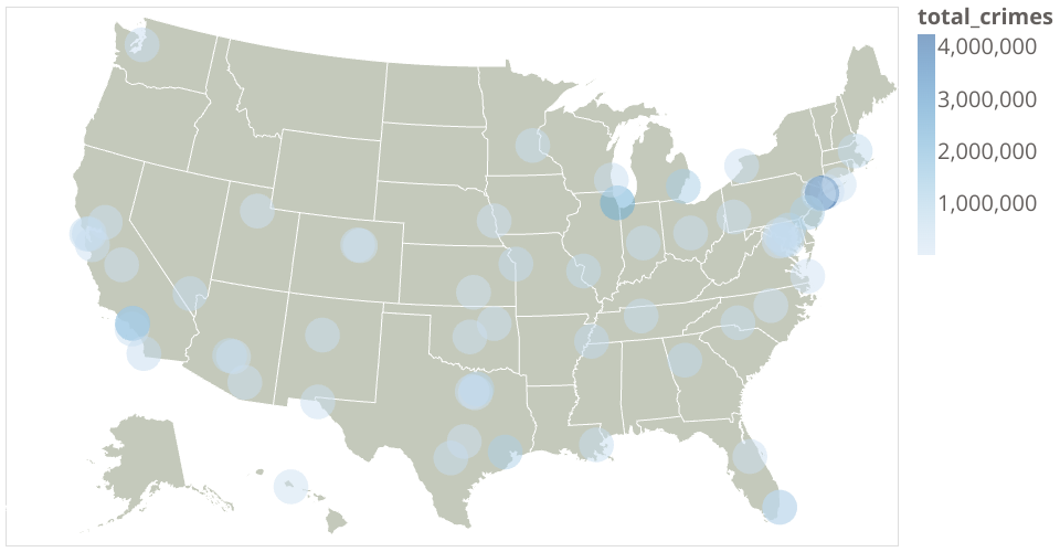 Crimes map from crimes dataset. The data originally comes from the U.S. Metro Areas Violent Crime Rates by Type, 1975-2015