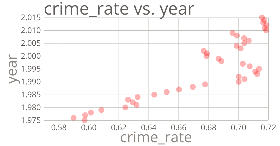 This scatter plot shows relationship between crime_rate and year, from U.S. Metro Areas Violent Crime Rates by Type. The crime rate is calculated using total number of crimes in each year divided by total number of populations.