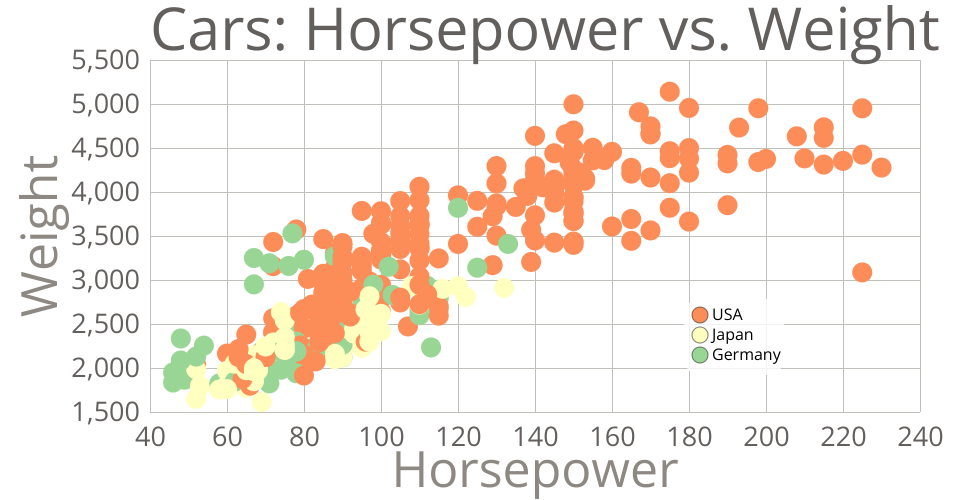 This scatter plot shows data about cars with a selectable legend for filtering, from UCI Machine Learning Repository: Auto MPG Data Set.